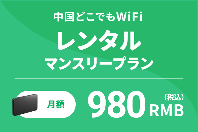 ・30日間980RMBのシンプル料金です(渡航前日をご利用開始日として課金開始)。その他の送料・受取手数料はありません。