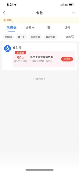 クーポン券を獲得できた場合は、アプリ内の「卡包」メニューにこれが表示されます。