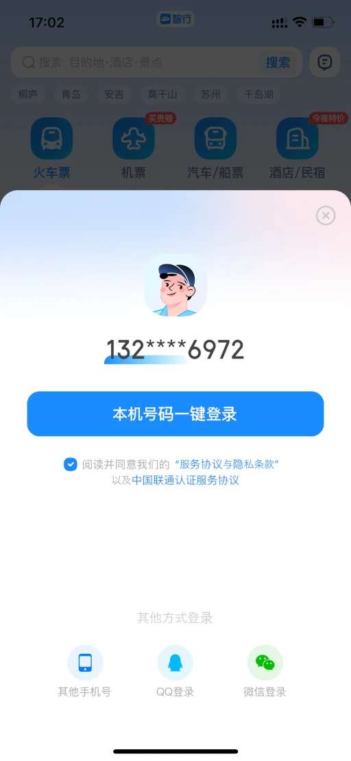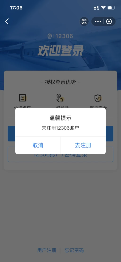 12306へのリンク画面が表示された後、中国携帯電話番号によるショートメッセージ認証が必要となります。