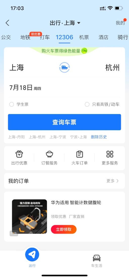 新幹線の予約はアリペイと連携した火车票机票(12306)を利用