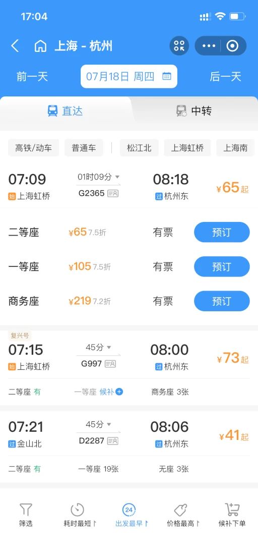 ここでは乗車駅に「上海」、行き先に「杭州」を選択しました。