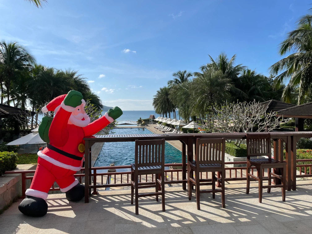 12月のクリスマスシーズンですからサンタクロースがお出迎えをしており、ビーチとのコントラストも南国リゾートならではの感覚です。
